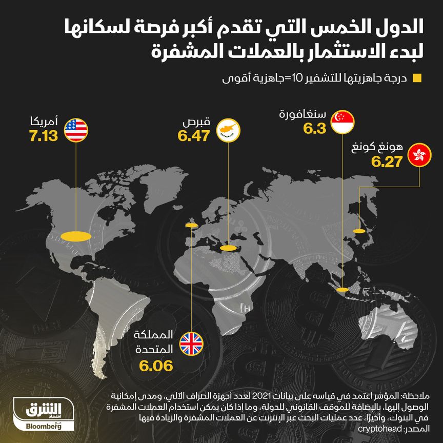تعتبر الولايات المتحدة الأمريكية الدولة التي تقدم أكبر الفرص لسكانها لبدء الاستثمار في العملات المشفرة عالمياً، حيث بلغت درجة جاهزيتها للتشفير 7.13 من 10 ضمن هذا المؤشر. تلتها في ذلك قبرص بدرجة 6.47، ثم سنغافورة بدرجة 6.3، وفي المرتبة الرابعة على هذا المؤشر أتت هونغ كونغ بدرجة 6.27، وفي المرتبة الخامسة المملكة المتحدة بدرجة 6.06.