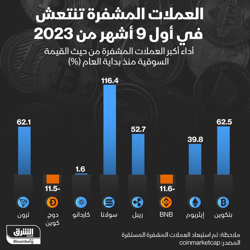 ارتفعت أكبر عملة مشفرة "بتكوين" بنحو 62% في الأشهر التسعة الأولى من 2023، لتسجل بنهاية سبتمبر 27 ألف دولار، بحسب "كوين ماركت كاب".