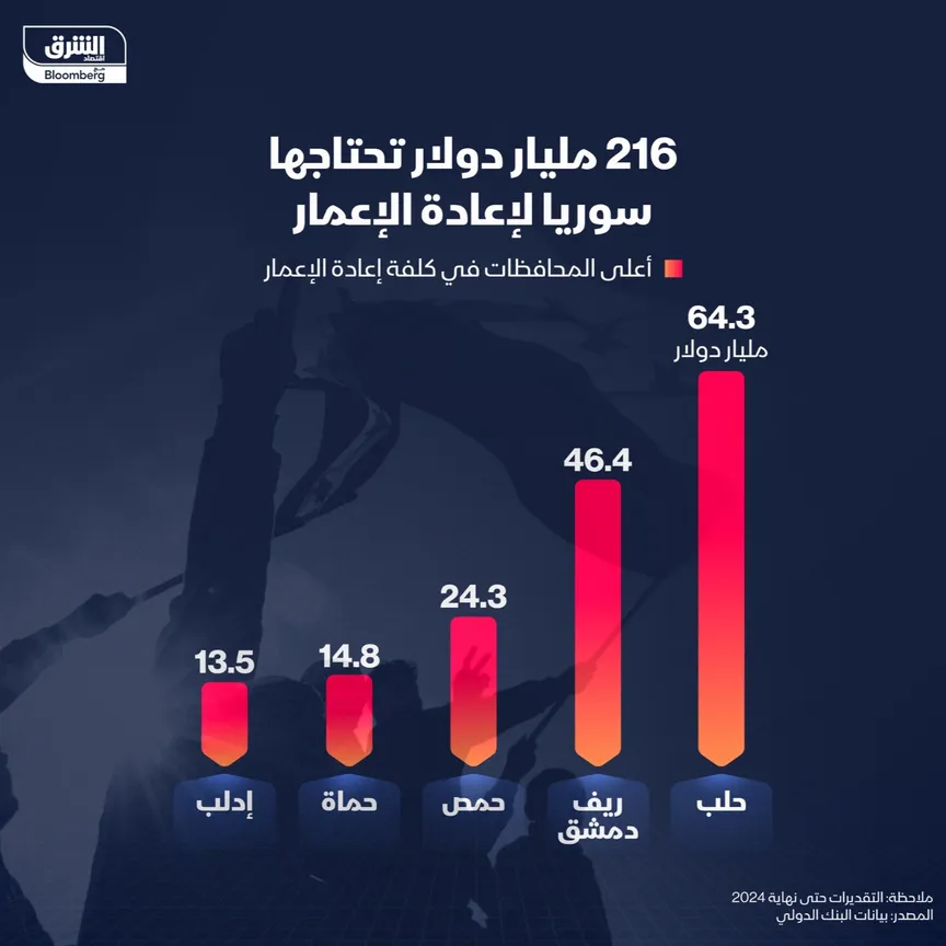 وبحسب بيانات البنك الدولي، تصدرت محافظة حلب القائمة بأعلى كلفة بلغت 64.3 مليار دولار، تلتها ريف دمشق بـ46.4 مليار دولار، ثم حمص بـ24.3 مليار دولار، وحماة بـ14.8 مليار دولار، في حين بلغت كلفة إعادة الإعمار في إدلب 13.5 مليار دولار.