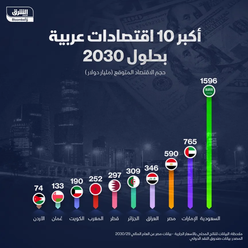 تتصدر السعودية قائمة أكبر الاقتصادات العربية بحلول عام 2030، إذ يُتوقع أن يبلغ حجم اقتصادها نحو 1.6 تريليون دولار، بحسب بيانات صندوق النقد الدولي.