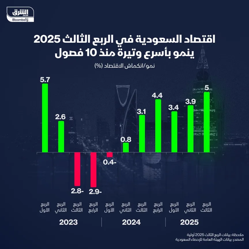سجل الاقتصاد السعودي في الربع الثالث من عام 2025 نمواً بنسبة 5%، وهو الأسرع منذ 10 فصول متتالية، بعد تعافٍ تدريجي من الانكماش الذي شهده عام 2023.