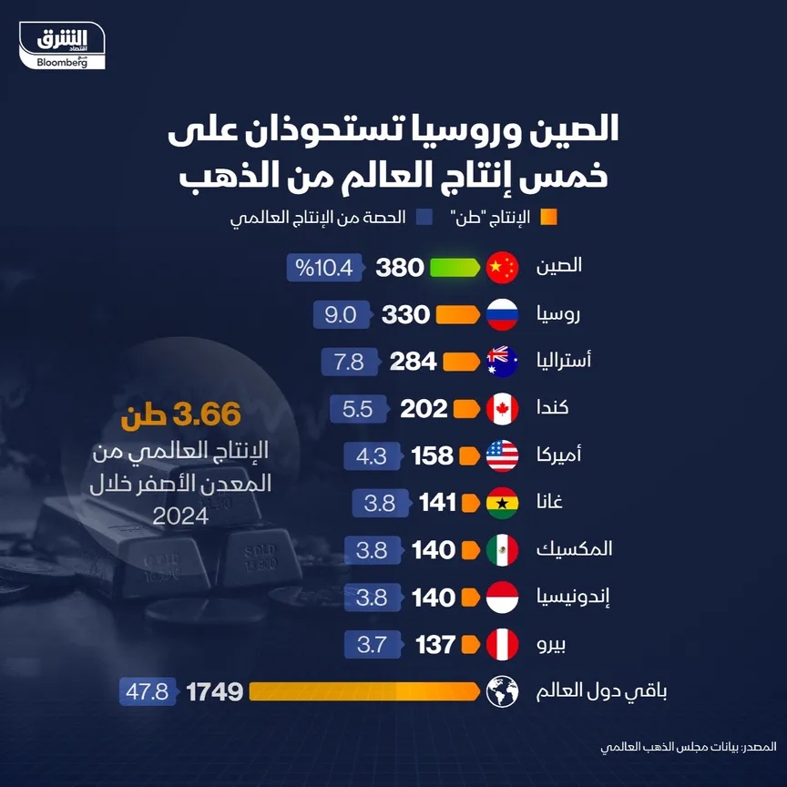 استحوذت الصين وروسيا على نحو خُمس إنتاج العالم من الذهب خلال عام 2024، بإجمالي إنتاج بلغ 380 و330 طناً على التوالي، وفق بيانات مجلس الذهب العالمي.