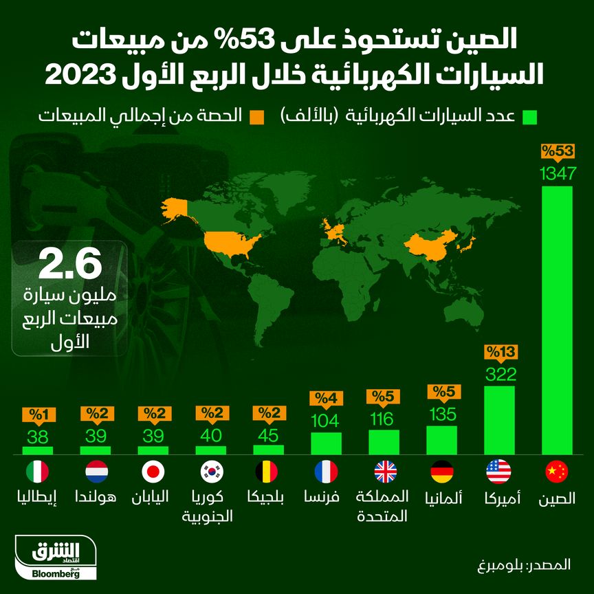 استحوذت الصين على نصيب الأسد من السيارات الكهربائية المَبيعة حول العالم في الربع الأول بحصة قدرها 53%، متفوقة بفارق كبير على الولايات المتحدة التي احتلت المركز الثاني بحصة 13%.